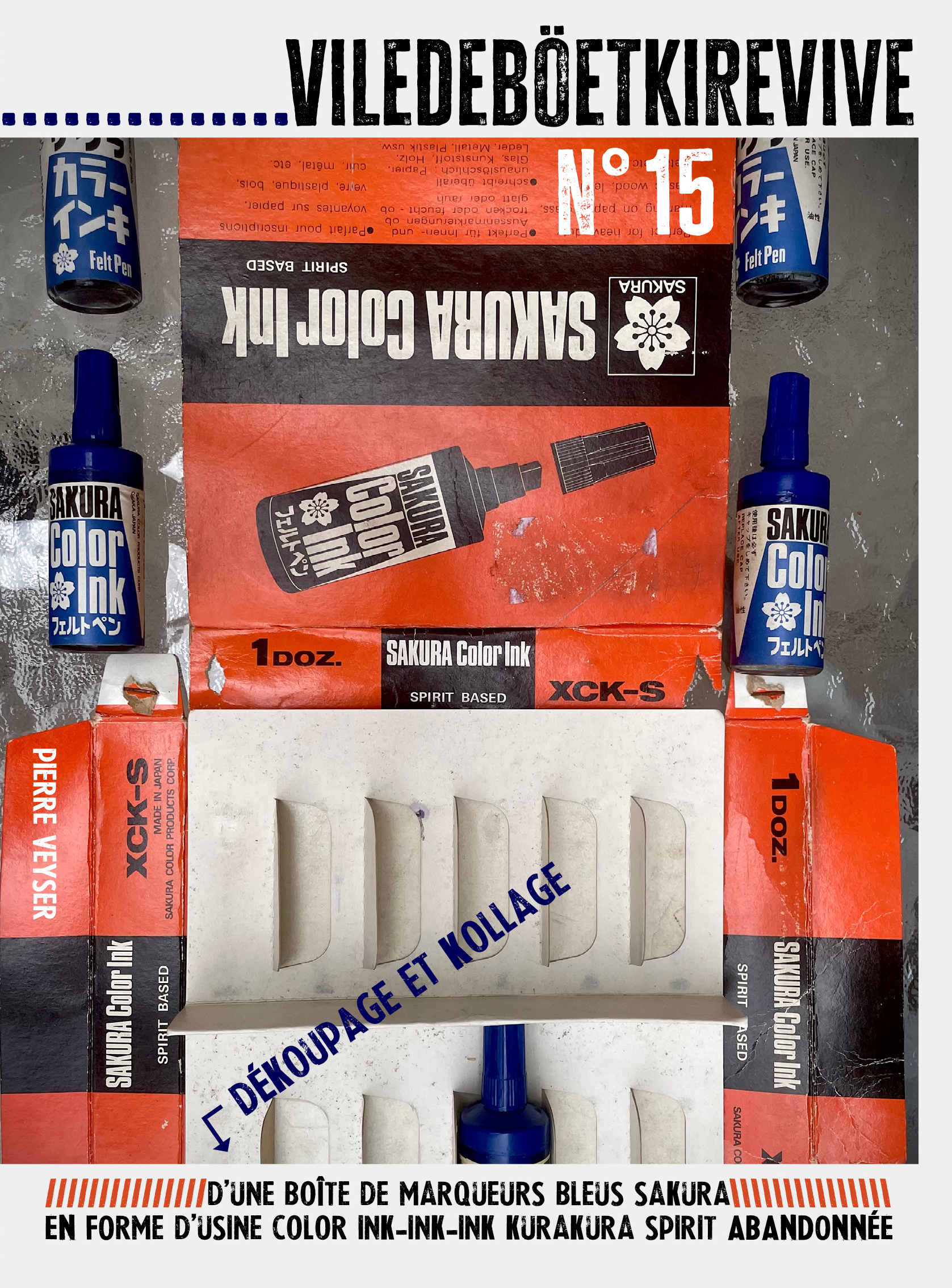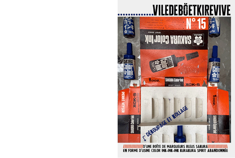 Dékoupage et kollage d’une boîte de marqueurs bleu sakura en forme d’usine color ink-ink-ink kurakura spirit abandonnée