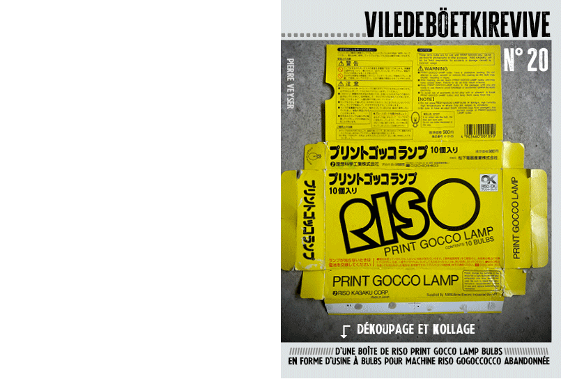 Dékoupage et kollage d’une boîte de riso print gocco lamp bulbs en forme d’usine à bulbs pour machine riso gogoccocco abandonnée