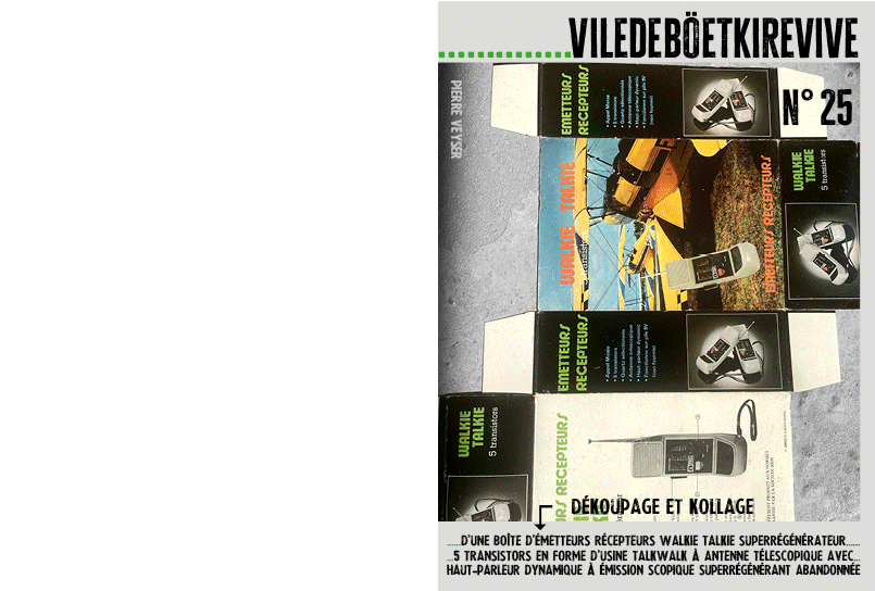 Dékoupage et kollage d’une boîte d’émetteurs récepteurs walkie talkie superrégénerateur…5 transistors en forme d’usine talkwalk à antenne télescopique avec haut-parleur dynamique à émission scopique superrégénérant abandonnée.