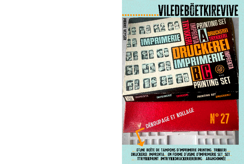 Dékoupage et kollage d’une boîte de tampons d’imprimerie…PRINTING…TRIKKERI…DRUCKEREI…IMPRENTA… en forme d’usine d’imprimerie SET… SET…TTRYKKPRINT…IMTRYKKDRUCKERIERERING… abandonnée