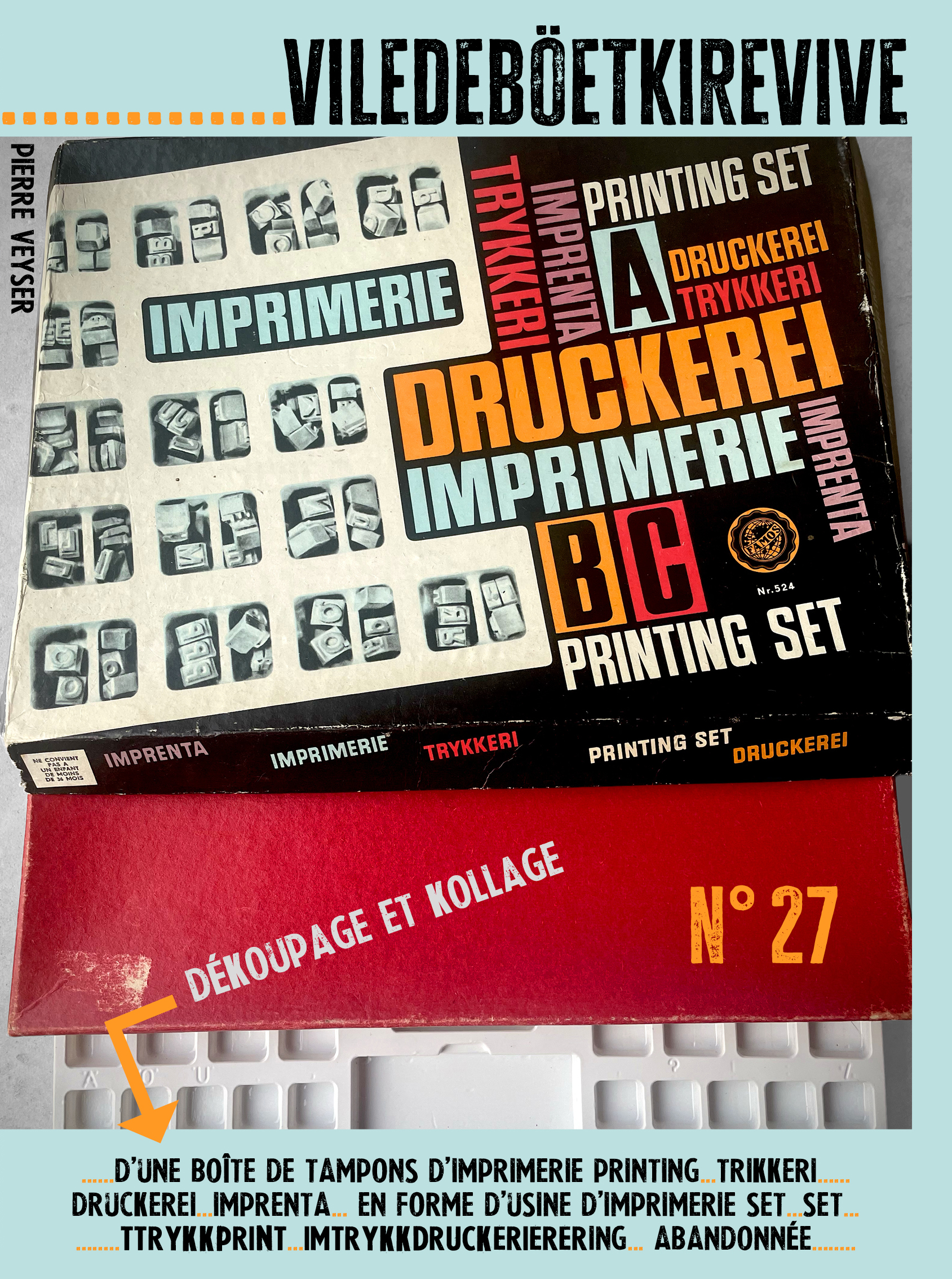 Dékoupage et kollage d’une boîte de tampons d’imprimerie…PRINTING…TRIKKERI…DRUCKEREI…IMPRENTA… en forme d’usine d’imprimerie SET… SET…TTRYKKPRINT…IMTRYKKDRUCKERIERERING… abandonnée