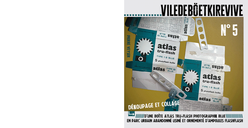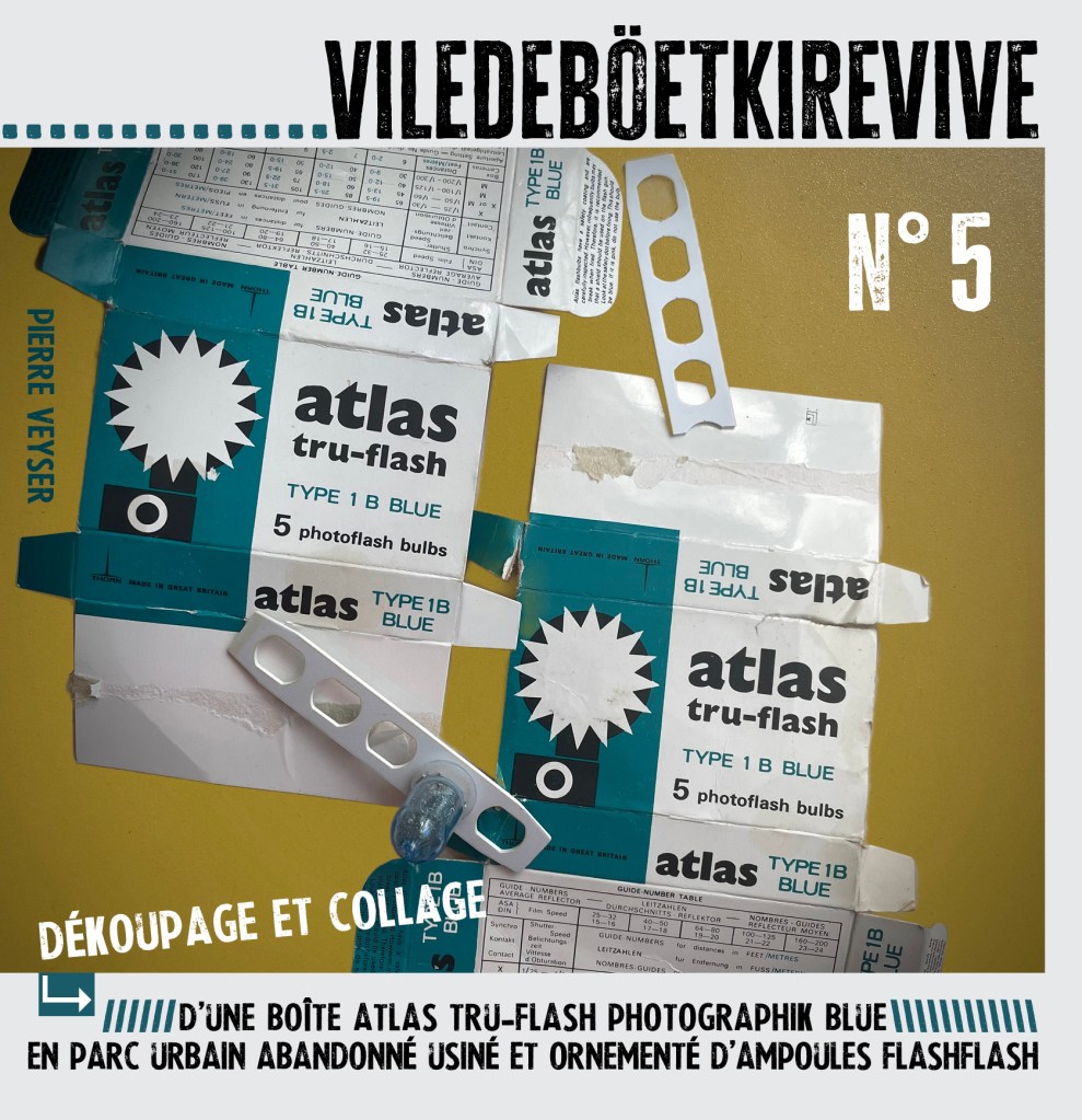 Dékoupage et collage d’une boîte Atlas tru-flash photographik blue en parc urbain abandonné usiné et ornementé d’ampoules flashflash
